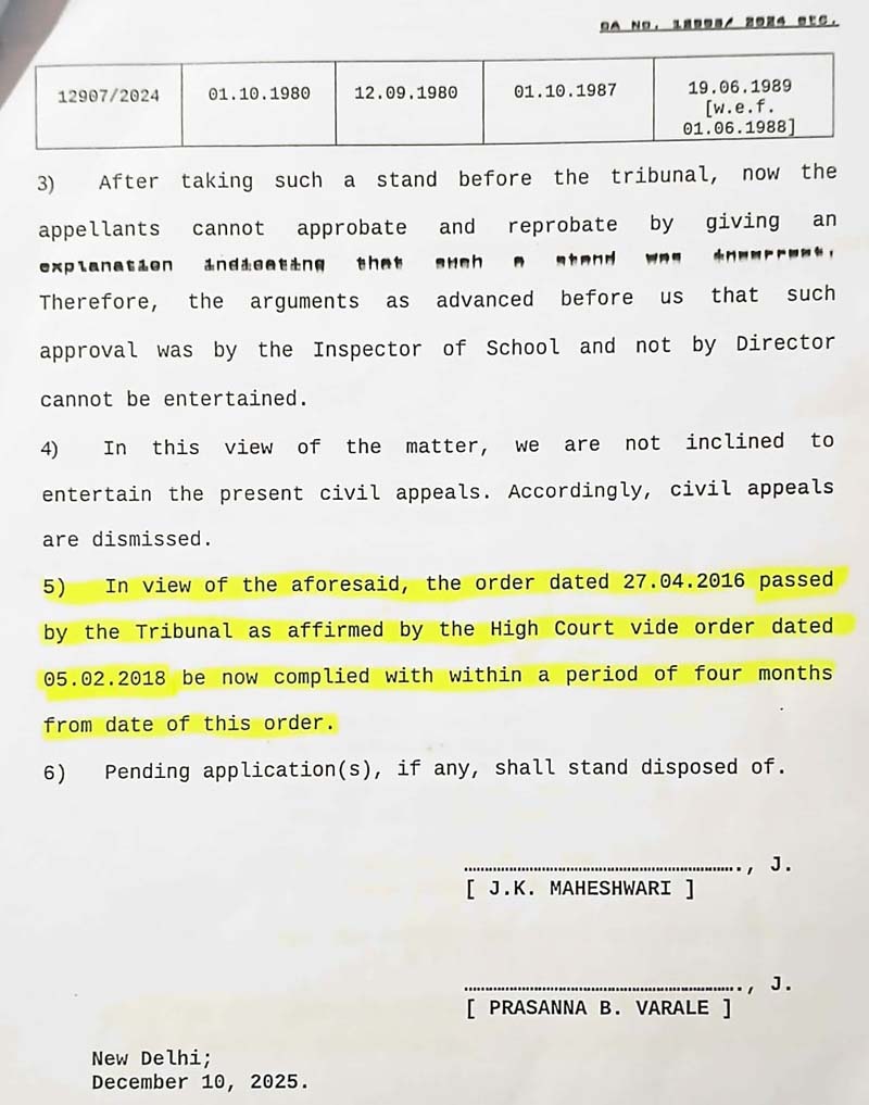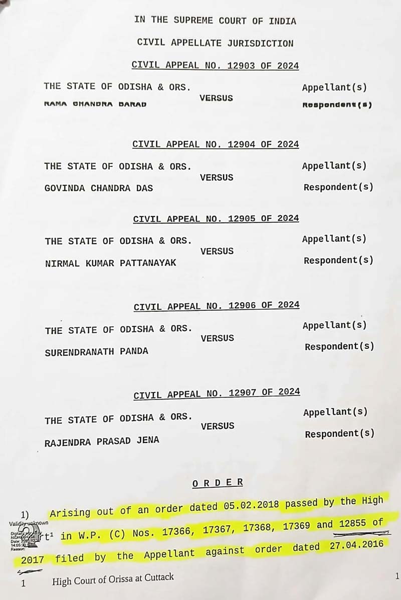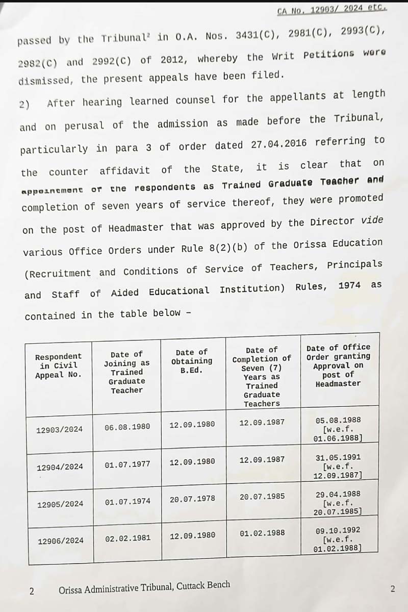 ସୂଚନା ଅନୁଯାୟୀ ଗତ ଡିସେମ୍ବର ୧୦ ତାରିଖରେ ସୁପ୍ରିମକୋର୍ଟ ରାଜ୍ୟ ସରକାରଙ୍କ ଭୁଲ ନିଷ୍ପତ୍ତି ଯୋଗୁଁ କ୍ଷତିଗ୍ରସ୍ତ ହୋଇଥିବା ୧୯୯ ପ୍ରଧାନ ଶିକ୍ଷକଙ୍କ ସପକ୍ଷରେ ଏକ ଗୁରୁତ୍ୱପୂର୍ଣ୍ଣ ରାୟ ଦେଇଛନ୍ତି। ଏହି ଶିକ୍ଷକମାନେ ୩ ଜୁନ ୧୯୮୮ ପୂର୍ବରୁ ୭ବର୍ଷର ଟିଜି ଶିକ୍ଷକ ଭାବେ ଅଭିଜ୍ଞତା ହାସଲ ପରେ ୧୯୭୪ ଶିକ୍ଷାସେବା ଆଇନର ୮(୨) ବି ଧାରା ଅନୁଯାୟୀ ମାଧ୍ୟମିକ ଶିକ୍ଷା ନିର୍ଦେଶକଙ୍କ ଅନୁମୋଦନ ପାଇ ସ୍ଥାୟୀ ପ୍ରଧାନ ଶିକ୍ଷକ ପଦକୁ ଉନ୍ନୀତ ହୋଇଥିଲେ। କିଛି କନିଷ୍ଠ ଶିକ୍ଷକଙ୍କ କୋର୍ଟ ମାମଲାର ବାହାନା ନେଇ ପୂର୍ବର କୁଚକ୍ରୀ ସରକାର ଓ ସରକାରୀ କଳ ପ୍ରଥମେ ୯ ଜୁଲାଇ ୨୦୦୨ରେ ୧୧ ମାସ ପାଇଁ ଓ ପରେ ୧ ସେପ୍ଟେମ୍ବର ୨୦୧୨ରେ ବରିଷ୍ଠ ତଥା ବୟସ୍କ ପ୍ରଧାନ ଶିକ୍ଷକଙ୍କୁ ଟିଜି ଶିକ୍ଷକ ପଦରୁ ଅବନତ କରିଥିଲେ।