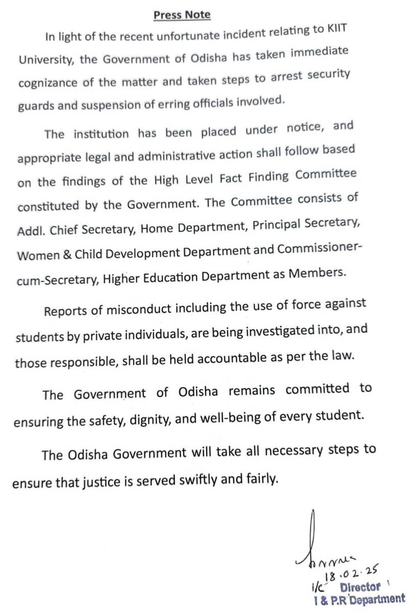 ସରକାର ଏକ ଉଚ୍ଚସ୍ତରୀୟ କମିଟି ଗଠନ କରିଛନ୍ତି। ବିଶ୍ୱବିଦ୍ୟାଳୟକୁ ନୋଟିସ୍ ଜାରି କରାଯିବା ସହ ଗୃହ ସଚିବ ସତ୍ୟବ୍ରତ ସାହୁ, ମହିଳା ଓ ଶିଶୁବିକାଶ ବିଭାଗ ସଚିବ ଶୁଭା ଶର୍ମା ଓ ଉଚ୍ଚଶିକ୍ଷା ସଚିବ ଅରବିନ୍ଦ ଅଗ୍ରୱାଲଙ୍କୁ ନେଇ ଏହି କମିଟି ଗଠନ କରାଯାଇଛି । କମିଟିର ରିପୋର୍ଟ ଆଧାରରେ ଆବଶ୍ୟକ ଆଇନଗତ ଓ ପ୍ରଶାସନିକ କାର୍ଯ୍ୟାନୁଷ୍ଠାନ ଗ୍ରହଣ କରାଯିବ ବୋଲି ସରକାର ସୂଚନା ଦେଇଛନ୍ତି।