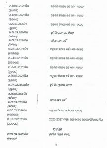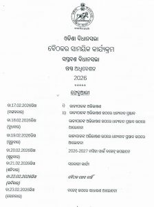 ଫେବୃଆରୀ ୧୭ ତାରିଖ ଅଧିବେଶନର ପ୍ରଥମ ଦିନ ଗୃହରେ ରାଜ୍ୟପାଳ ଅଭିଭାଷଣ ରଖିବେ । ୧୮ ଓ ୧୯ ତାରିଖରେ ରାଜ୍ୟପାଳଙ୍କ ଅଭିଭାଷଣ ଉପରେ ଧନ୍ୟବାଦ ପ୍ରସ୍ତାବ ଆସି ଆଲୋଚନା ହେବ । ୨୦ ତାରିଖରେ ୨୦୨୬-୨୦୨୭ ଆର୍ଥିକ ବର୍ଷର ବଜେଟ ଆଗତ ହେବ । ୨୩ ଓ ୨୪ ତାରିଖରେ ବଜେଟ ଉପରେ ସାଧାରଣ ଆଲୋଚନା କରାଯିବ । ମାର୍ଚ୍ଚ ୧୦ରୁ ୩୦ ତାରିଖ ପର୍ଯ୍ୟନ୍ତ ବିଭିନ୍ନ ବିଭାଗର ଖର୍ଚ୍ଚ ଦାବି ଆଲୋଚନା ଉପରେ ହେବ ଏବଂ ମାର୍ଚ୍ଚ ୩୧ ତାରିଖରେ ବ୍ୟୟମଞ୍ଜୁରି ବିଲ୍ ପାରିତ ହେବ।