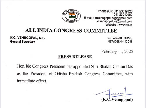 ଓଡ଼ିଶା ପ୍ରଦେଶ କଂଗ୍ରେସ କମିଟିର ସଭାପତି ଭାବେ ଭକ୍ତ ଚରଣ ଦାସଙ୍କୁ ନିଯୁକ୍ତି ମିଳିଛି। ଏଆଇସିସି ପକ୍ଷରୁ ଆଜି ଏହି ସୂଚନା ଜାରି କରାଯାଇଛି । ଶରତ ପଟ୍ଟନାୟକଙ୍କ ଇସ୍ତଫା ପରେ ଗତ ଜୁଲାଇ ମାସରୁ ପିସିସି ସଭାପତି ପଦ ଖାଲି ପଡ଼ିଥିଲା।