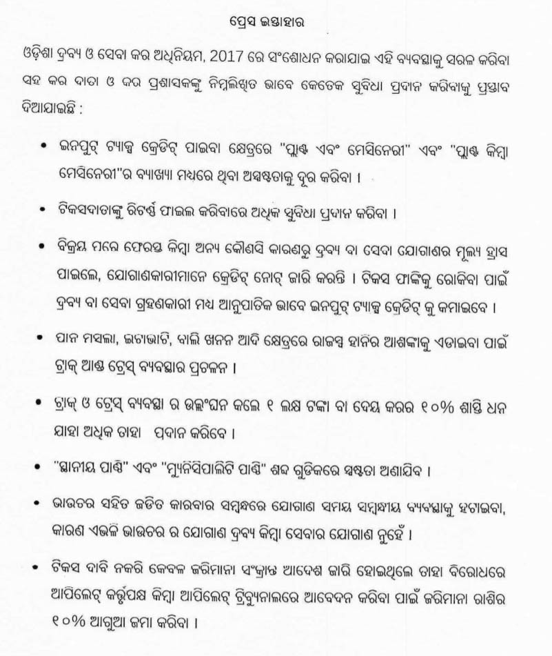 ଭୁବନେଶ୍ୱର :1/8-ବାଲି ଉତ୍ତୋଳନ, ଇଟାଭାଟି ଓ ପାନମସଲା କ୍ଷେତ୍ରରେ ରାଜସ୍ୱହାନିକୁ ରୋକିବା ନିମନ୍ତେ ଏଣିକି ‘ଟ୍ରାକ୍ ଆଣ୍ଡ ଟ୍ରେସ୍’ ବ୍ୟବସ୍ଥାକୁ ଉପଯୋଗ କରି ଜୋରିମାନା ଆଦାୟ କରାଯିବାକୁ ଆଜି ମୁଖ୍ୟମନ୍ତ୍ରୀ ମୋହନ ଚରଣ ମାଝୀଙ୍କ ଅଧ୍ୟକ୍ଷତାରେ ଅନୁଷ୍ଠିତ କ୍ୟାବିନେଟ ବୈଠକରେ ନିଷ୍ପତ୍ତି ହୋଇଛି। ଏଥିପାଇଁ ଜିଏସଟି ଆଇନ-୨୦୧୭ରେ ସଂଶୋଧନକୁ ବୈଠକରେ ମଞ୍ଜୁରୀ ମିଳିଛି।
