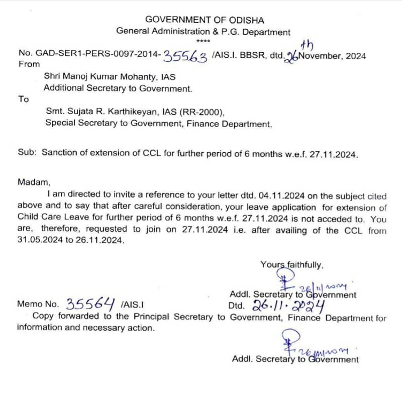 ଭୁବନେଶ୍ୱର:26/11/2024- 2000 ବ୍ୟାଚର ଆଇଏଏସ ସୁଜାତା ଆର. କାର୍ତ୍ତିକେୟନଙ୍କ ଆଉ ଛଅମାସ ଛୁଟି ଆବେଦନକୁ ସରକାର ଅଗ୍ରାହ୍ୟ କରିଦେଇଛନ୍ତି। ପୂର୍ବରୁ ସେ ଛଅମାସ ପାଇଁ ଚାଇଲଡ କେୟାର ଲିଭ(ସି.ସି.ଏଲ) ନେଇଥିଲେ। ଏହାର ଅବଧି ନଭେମ୍ବର 26ରେ ସରିଛି ।  27 ତାରିଖରୁ ଆଉ ଛଅମାସ ପାଇଁ ଚାଇଲଡ କେୟାର ଲିଭ ସମୟ ଅବଧି ବଢାଇବାକୁ ସେ ଆବେଦନ କରିଥିଲେ। ସାଧାରଣ ପ୍ରଶାସନ ବିଭାଗ ଅତିରିକ୍ତ ସଚିବ ତାଙ୍କୁ ଏକ ପତ୍ର ଲେଖି ତାଙ୍କର ଛୁଟି ବଢାଇବା ଆବେଦନ ଅଗ୍ରାହ୍ୟ କରାଯାଇଥିବା ଉଲ୍ଲେଖ କରିଛନ୍ତି । ଏଥିସହ ନଭେମ୍ବର 27 ତାରିଖରେ କାର୍ଯ୍ୟରେ ଯୋଗଦେବାକୁ କହିଛନ୍ତି ।