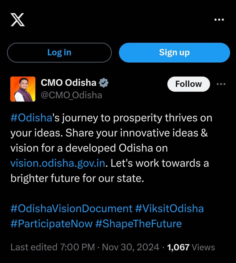 ଭୁବନେଶ୍ୱର:-୩୦ .୧୧ .୨୦୨୪ ପ୍ରଧାନମନ୍ତ୍ରୀ ନରେନ୍ଦ୍ର ମୋଦୀଙ୍କ ଓଡ଼ିଶା ଗସ୍ତ ପରିପ୍ରେକ୍ଷୀରେ ମୁଖ୍ୟମନ୍ତ୍ରୀ ମୋହନ ମାଝି ସୋସିଆଲ ମିଡ଼ିଆରେ କହିଛନ୍ତି, ଆୟୋଜିତ ‘ସମ୍ବର୍ଦ୍ଧନା ସଭା’ କାର୍ଯ୍ୟକ୍ରମରେ ବରିଷ୍ଠ ନେତୃତ୍ଵଙ୍କ ସହ ଯୋଗଦେଇ ଓଡ଼ିଶାବାସୀଙ୍କ ତରଫରୁ ଲୋକପ୍ରିୟ ପ୍ରଧାନମନ୍ତ୍ରୀଙ୍କୁ ପବିତ୍ର ଓଡ଼ିଶା ମାଟିକୁ ସ୍ଵାଗତ ଜଣାଇଲି।