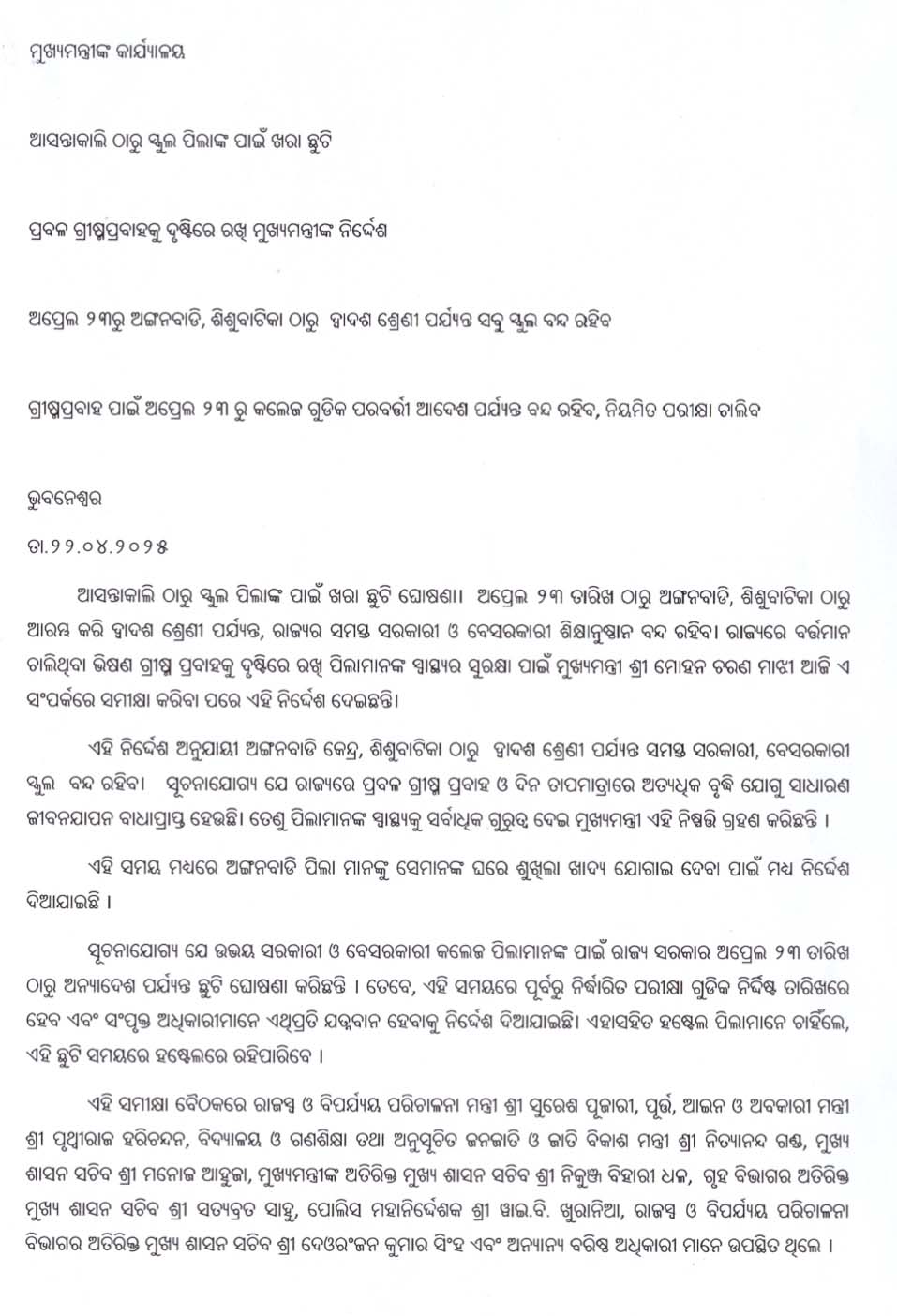 ଭୁବନେଶ୍ୱର:8/5- ପ୍ରବଳ ଗ୍ରୀଷ୍ମପ୍ରବାହକୁ ଦୃଷ୍ଟିରେ ରଖି ରାଜ୍ୟ ସରକାର ୨୦୨୫ ଅପ୍ରେଲ ୨୨ ତାରିଖରେ ସମସ୍ତ ଶିକ୍ଷାନୁଷ୍ଠାନଗୁଡ଼ିକୁ ଛୁଟି ଘୋଷଣା କରିଥିଲେ। ଇତି ମଧ୍ୟରେ 17 ଦିନ ବିତି ଯାଇଥିବା ବେଳେ କେତେକ ଶିକ୍ଷାନୁଷ୍ଠାନ ସରକାରୀ ନିର୍ଦେଶ ପାଳନ କରି ନ ଥିବା ବିଭାଗୀୟ ଅଧିକାରୀ ଜାଣିବାକୁ ପାଇଛନ୍ତି। ତଦାରଖ ଅଭାବରୁ କେତେକ ସ୍ଥାନରେ ଏହାର ବ୍ୟତିକ୍ରମ ଦେଖିବାକୁ ମିଳିଥିବା ଆଜି ବିଭାଗ ପକ୍ଷରୁ ଏକ ପ୍ରେସ ବାର୍ତ୍ତାରେ କୁହାଯାଇଛି । ଅନେକ ସ୍ଥାନରେ ଶିକ୍ଷାନୁଷ୍ଠାନ ଛୁଟି କରାଯାଇନଥିବା ନେଇ ନିୟମର ଉଲ୍ଲଙ୍ଘନ ହୋଇଥିବା ବିଭାଗର‌ ଦୃଷ୍ଟିଗୋଚର ହୋଇଛି। ଏନେଇ ଏକ ନିର୍ଦ୍ଦେଶନାମା ସମସ୍ତ ଜିଲ୍ଲାକୁ ଜାରି କରିଛି ବିଦ୍ୟାଳୟ ଓ ଗଣଶିକ୍ଷା ବିଭାଗ। ଯେଉଁଠାରେ ସରକାରୀ ନିର୍ଦ୍ଦେଶନାମା ପାଳନ କରାଯାଉନଥିବା ଦୃଷ୍ଟିଗୋଚର ହୁଏ ତେବେ ସେଠାରେ କଠୋର କାର୍ଯ୍ୟାନୁଷ୍ଠାନ ଗ୍ରହଣ କରିବାକୁ ଚିଠି ମାଧ୍ୟମରେ ନିର୍ଦ୍ଦେଶ ଦିଆଯାଇଛି।