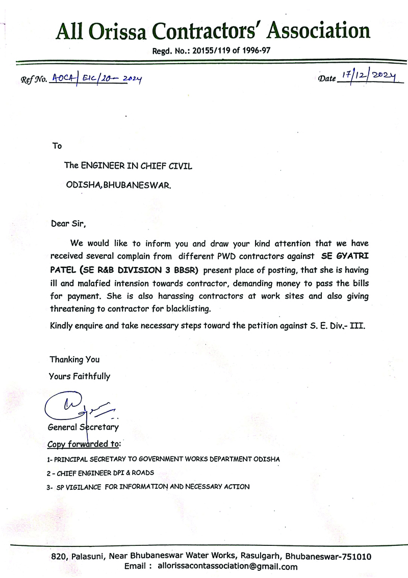 ଭୁବନେଶ୍ୱର ପୂର୍ତ୍ତ ଡିଭିଜନ-୩ ଅଧୀନରେ ବିସ୍ତୃତ ଅଞ୍ଚଳ ଥିଲେ ମଧ୍ୟ କୌଣସି ଜାଗାରେ କାମ ଠିକ୍ ଭାବେ ହେଉନଥିବା ଅଭିଯୋଗ ହୋଇଛି। ଅଧିକାରୀମାନେ କାମ ଯଥା ସମୟରେ ନସାରିବା ଏବଂ ଅନେକ ଗୁରୁତ୍ୱପୂର୍ଣ୍ଣ ରାସ୍ତା କାମ ବର୍ଷାଧିକ କାଳ ଧରି ପକେଇ ରଖିବା ଯୋଗୁଁ ସଂପୃକ୍ତ ଅଞ୍ଚଳରେ ଜନ ଅସନ୍ତୋଷ ଲାଗି ରହିଛି। ଦାୟିତ୍ୱରେ ଥିବା ସଂପୃକ୍ତ ଅଧୀକ୍ଷଣ ଯନ୍ତ୍ରୀଙ୍କ କାର୍ଯ୍ୟକଳାପ ବିରୋଧରେ ଠିକାଦାର ସଂଘ ପକ୍ଷରୁ ମୁଖ୍ୟଯନ୍ତ୍ରୀଙ୍କୁ ଅଭିଯୋଗ ପତ୍ର ଦିଆଯାଇଛି।