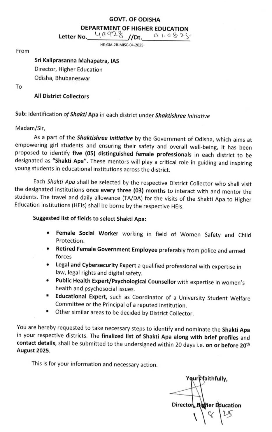 ଶକ୍ତିଶ୍ରୀ ସଂଯୋଜିକା ଓ ଶକ୍ତିଅପାଙ୍କୁ ମନୋନୀତ କରିବା ପାଇଁ ଉଚ୍ଚଶିକ୍ଷା ବିଭାଗର ନିର୍ଦ୍ଦେଶ