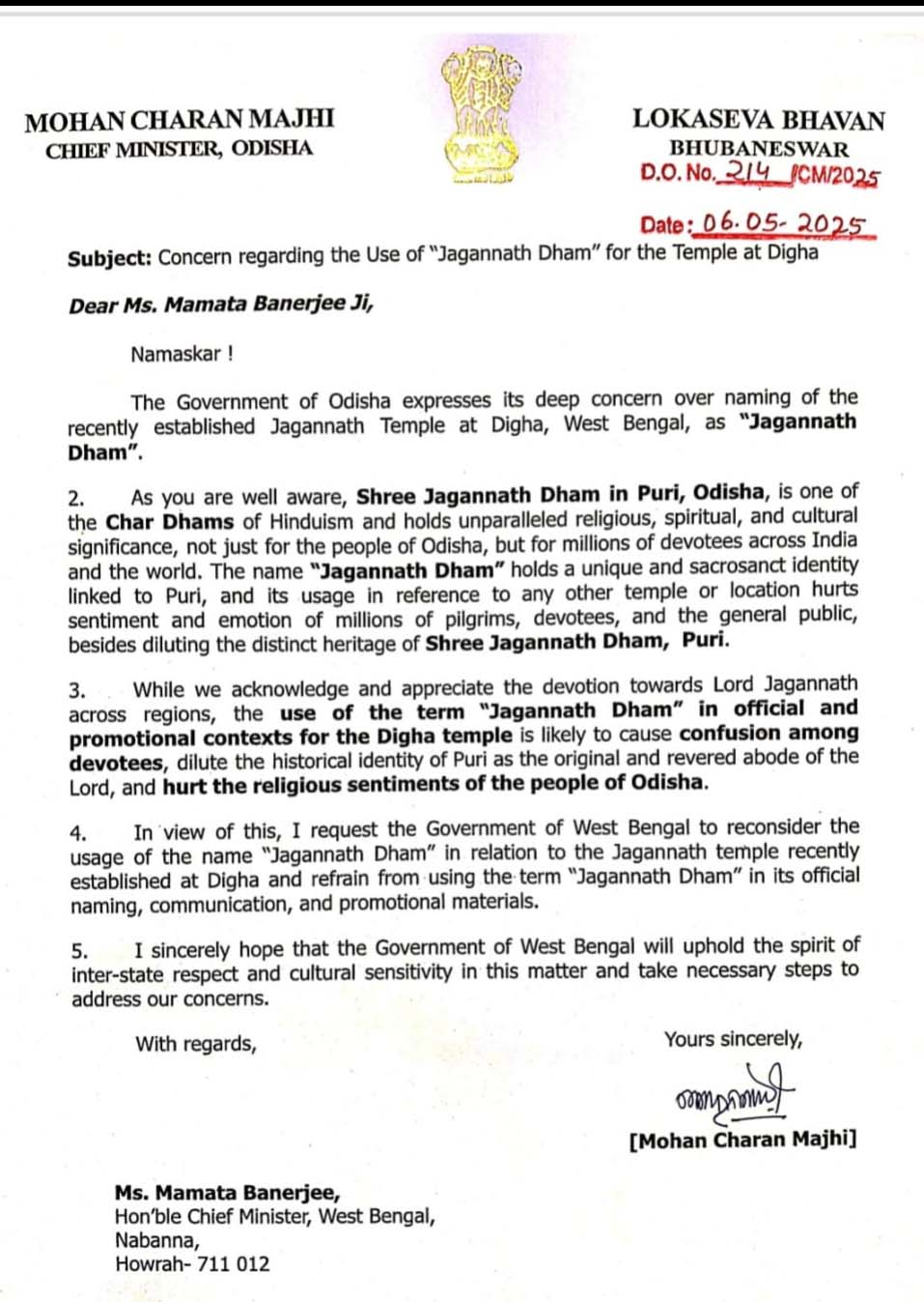 ଓଡ଼ିଶାର ମୁଖ୍ୟମନ୍ତ୍ରୀ ଭାବରେ ମୁଁ ପଶ୍ଚିମବଙ୍ଗର ମୁଖ୍ୟମନ୍ତ୍ରୀ ମମତା ବାନାର୍ଜୀଙ୍କୁ ଚିଠି ଲେଖି ଦୀଘାର ନୂତନ ଜଗନ୍ନାଥ ମନ୍ଦିର ପାଇଁ ‘ଜଗନ୍ନାଥ ଧାମ’ ନାମ ବ୍ୟବହାର ବିଷୟରେ ଆମର ଗଭୀର ଚିନ୍ତା ବ୍ୟକ୍ତ କରିବା ସହ ‘ଜଗନ୍ନାଥ ଧାମ’ ନାମ ବ୍ୟବହାରରୁ ବିରତ ରହିବାକୁ ଅନୁରୋଧ କରିଛି।
