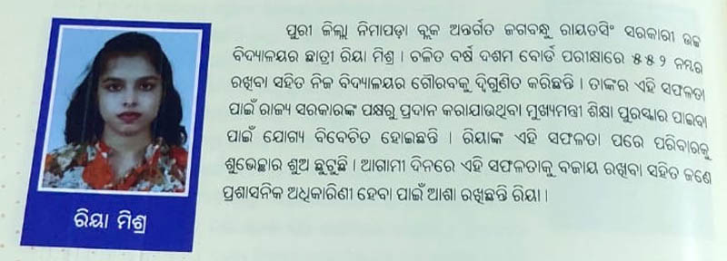ଏହି କାର୍ଯ୍ୟକ୍ରମରେ ଦଶମ ବୋର୍ଡ ପରୀକ୍ଷାରେ ୫୫୨ନମ୍ବର ରଖି ଶିକ୍ଷା ପୁରସ୍କାର ପାଇଥିବା ନିମାପଡ଼ା ଜେ.ବି.ଆର ସରକାରୀ ବାଳିକା ଉଚ୍ଚ ବିଦ୍ୟାଳୟର ଛାତ୍ରୀ ରିୟା ମିଶ୍ରଙ୍କୁ ପୁରସ୍କୃତ କରାଯାଇଥିଲା। ରିୟା ଜଣେ କୃତି ଛାତ୍ରୀ ଏବଂ ପ୍ରାଥମିକ ବିଦ୍ୟାଳୟସ୍ତରରୁ ବୃତ୍ତି ପାଇ ଆସୁଛନ୍ତି। ମୁଖ୍ୟମନ୍ତ୍ରୀଙ୍କ ଘୋଷଣା ଅନୁଯାୟୀ ରିୟାଙ୍କୁ ପୁରସ୍କାର ବାବଦ ଯେଉଁ ୫୦ ହଜାର ଟଙ୍କା ମିଳିବା କଥା ତାହା ବର୍ଷେ ପରେ ବି ମିଳିପାରି ନାହିଁ।