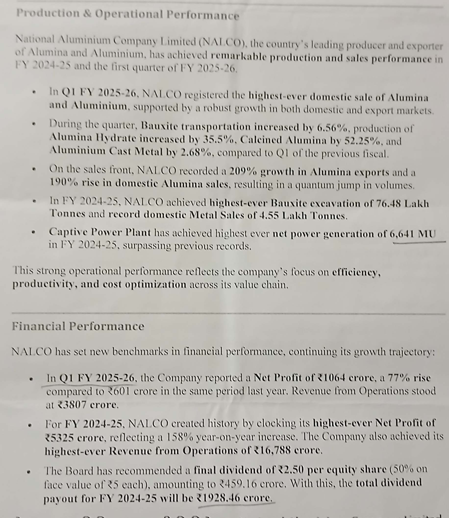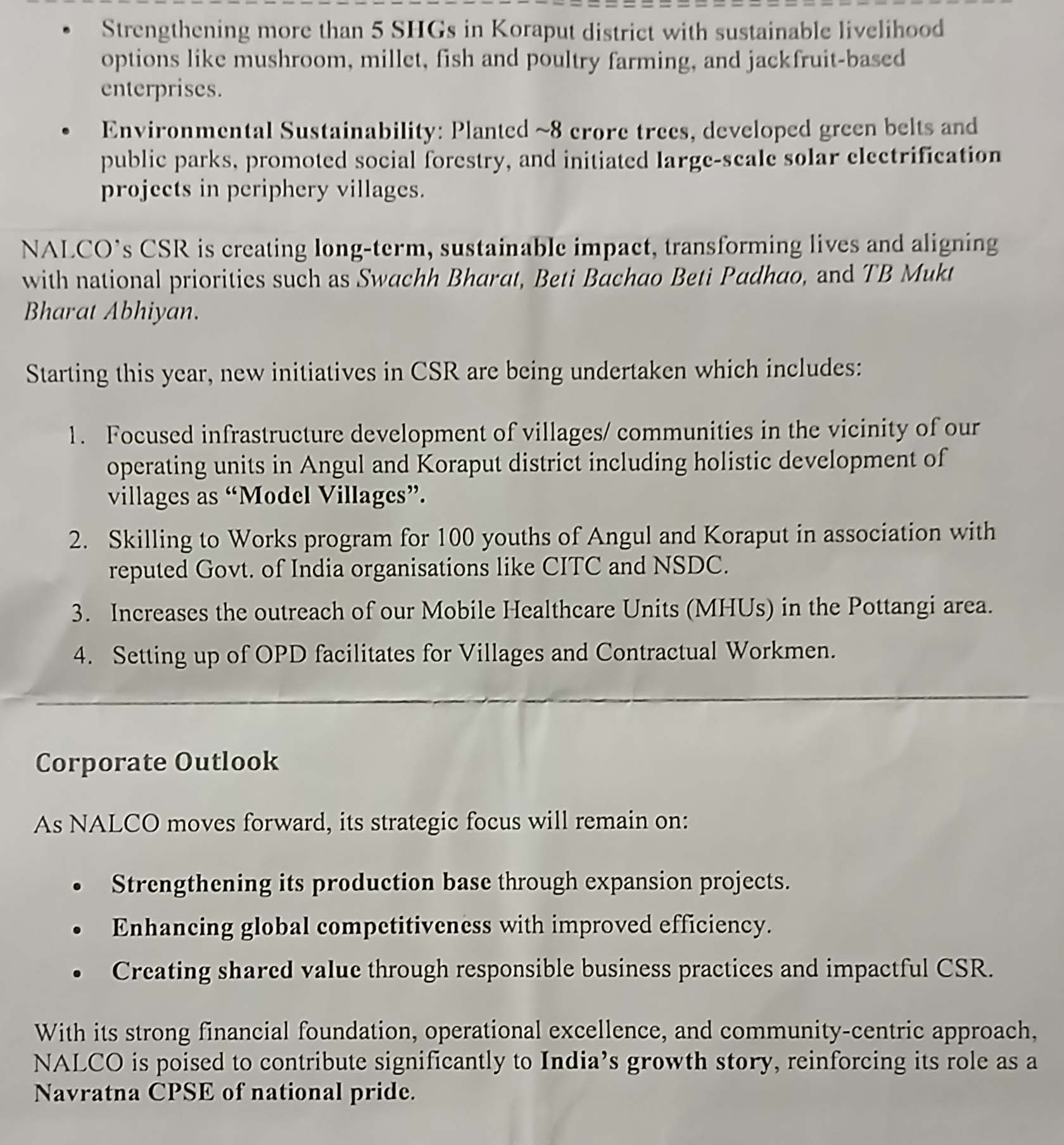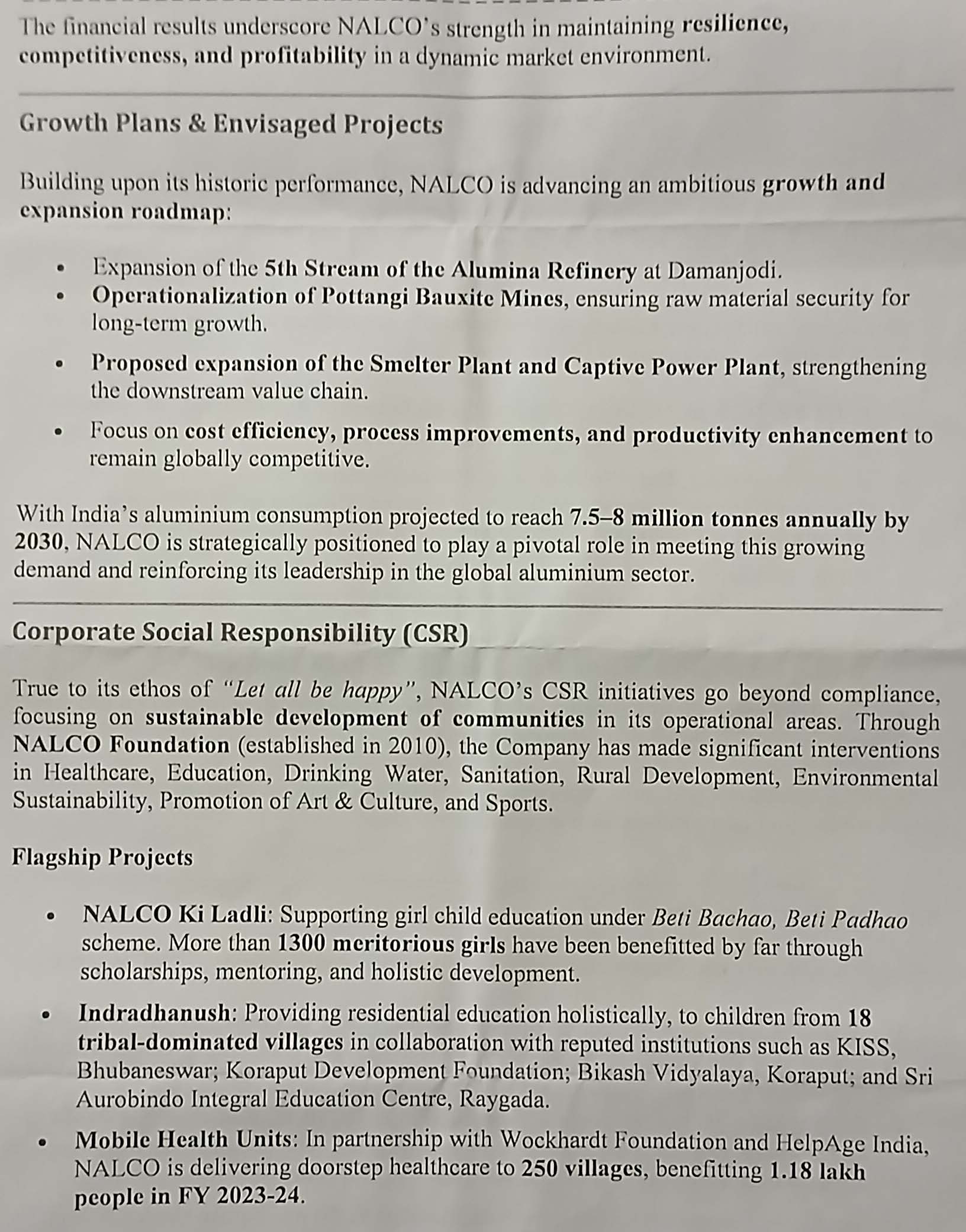 ପରିବେଶ ସୁରକ୍ଷା ଦିଗରେ ନାଲକୋ ଯଥେଷ୍ଟ ଯତ୍ନାବନ ଅଛି। ଦାମନଯୋଡି ସ୍ଥିତ ପଞ୍ଚମ ଆଲୁମିନା ରିଫାଇନାରୀ ସମ୍ପସ୍ରାରିତ ହେଲେ ଆମର ଉତ୍ପାଦ ବହୁ ଗୁଣରେ ବୃଦ୍ଧି ପାଇବ। ସେହିପରି ସ୍ମେଲଟର ପ୍ଲାଣ୍ଟ ଓ କ୍ୟାପଟିଭ ପାୱାର ପ୍ଲାଣ୍ଟକୁ ମଧ୍ୟ ସମ୍ପ୍ରସାରଣ କରିବା ପାଇଁ ପ୍ରକ୍ରିୟା ଆରମ୍ଭ ହୋଇଛି। ୨୦୩୦ ସୁଦ୍ଧା ଭାରତରେ ଉପଯୋଗ ପାଇଁ ବାର୍ଷିକ ୮ ନିୟୁତ ଟନ ଆଲୁମିନା ଆବଶ୍ୟକ ହେଉଥିବା ବେଳେ ଏହି ଆବଶ୍ୟକତାର ଏକ ବୃହତ୍ତ ଅଂଶ ନାଲକୋ ପୂରଣ କରି ପାରିବ। ସେ କହିଥିଲେ,, ଚଳିତ ଆର୍ଥିକ ବର୍ଷର ପ୍ରଥମ ତିନି ମାସରେ ବକ୍ସାଇଟ ପରିବହନ ୬.୫୬% ବୃଦ୍ଧି ପାଇଥିବା ବେଳେ ଆଲୁମିନା ହାଇଡ୍ରେଟ୍ ୩୫.୫%, କାଲସିନେଡ ଆଲୁମିନା ୫୨.୨୫%, ଆଲୁମିନା କାଷ୍ଟ ମେଟାଲ ଉତ୍ପାଦନ ୨.୬୮% ବୃଦ୍ଧି ପାଇଛି। ଆଲୁମିନା ରପ୍ତାନୀରେ ୨୦୯% ଅଭିବୃଦ୍ଧି ଆସିଥିବା ବେଳେ ଘରୋଇ କ୍ଷେତ୍ରରେ ବିକ୍ରି ୧୦୯% ବଢ଼ିଛି। କ୍ୟାପିଟିଭ୍ ପାୱାର ପ୍ଲାଣ୍ଟରୁ ଗତବର୍ଷ ୬୬୪୧ ନିୟୁତ ୟୁନିଟ ଶକ୍ତି ଉତ୍ପାଦିତ ହୋଇଥିଲା।