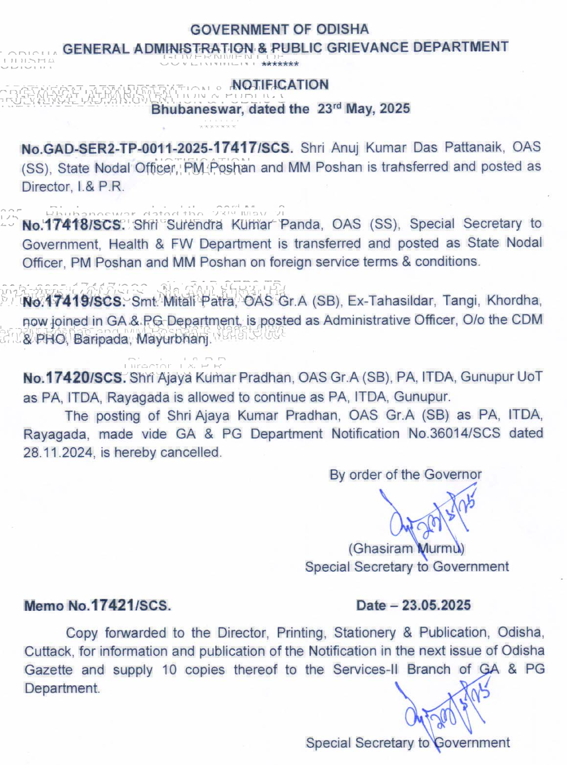ଖୋର୍ଦ୍ଧା ଜିଲା ଟାଙ୍ଗୀର ପୂର୍ବତନ ତହସିଲଦାର ଓଏଏସ୍ ମିତାଲି ପାତ୍ରଙ୍କୁ ବାରିପଦା ଜିଲ୍ଲା ମୁଖ୍ୟ ଚିକିତ୍ସାଳୟରେ ପ୍ରଶାସନିକ ଅଫିସର ଭାବେ ଅବସ୍ଥାପିତ କରାଯାଇଛି। ଗୁଣୁପୁର ଆଇଟିଡିଏ ପ୍ରକଳ୍ପ ଅଧିକାରୀ ଓଏଏସ୍ ଅଜୟ କୁମାର ପ୍ରଧାନଙ୍କ ବଦଳି ବାତିଲ କରି ତାଙ୍କୁ ସେଠାରେ କାର୍ଯ୍ୟ କରିବାକୁ ନିର୍ଦ୍ଦେଶ ଦିଆଯାଇଛି ।
