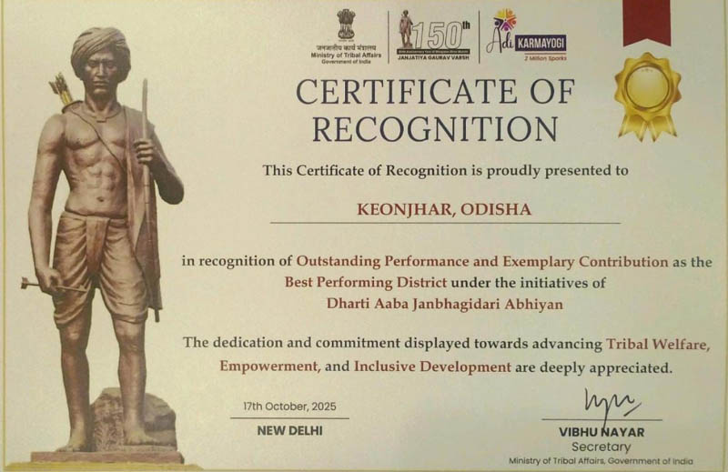 ଆଦି କର୍ମଯୋଗୀ ଅଭିଯାନ କ୍ଷେତ୍ରରେ ଶ୍ରେଷ୍ଠ ପ୍ରଦର୍ଶନକାରୀ ରାଜ୍ୟ ଭାବରେ ଓଡିଶା ସମ୍ମାନିତ ହୋଇଥିବା ବେଳେ ମୟୂରଭଞ୍ଜ ଜିଲ୍ଲା ଶ୍ରେଷ୍ଠ ଜିଲ୍ଲା ଭାବେ ବିବେଚିତ ହୋଇଛି। ସେହିପରି ଧରତୀ ଆବା ଜନଭାଗିଦାରୀ ଅଭିଯାନ ଅଧୀନରେ ଶ୍ରେଷ୍ଠ ପ୍ରଦର୍ଶନକାରୀ ଜିଲ୍ଲା ଭାବରେ କେନ୍ଦୁଝର ଜିଲ୍ଲାକୁ ସ୍ୱୀକୃତି ପ୍ରଦାନ କରାଯାଇଛି। ସେହିପରି ଶ୍ରେଷ୍ଠ ରାଜ୍ୟ ମାଷ୍ଟର ଟ୍ରେନର୍ ଭାବେ କୋରାପୁଟର ଅତିରିକ୍ତ ଜିଲ୍ଲା ମଙ୍ଗଳ ଅଧିକାରୀ ରାକେଶ ରଞ୍ଜନ ବିଶ୍ୱାଳ ଓ ଶ୍ରେଷ୍ଠ ଆଦି ସାଥି ଭାବେ କଳାହାଣ୍ଡି ଜିଲ୍ଲାର ସଞ୍ଜୀବ ମାଝୀ ସମ୍ମାନିତ ହୋଇଛନ୍ତି।
