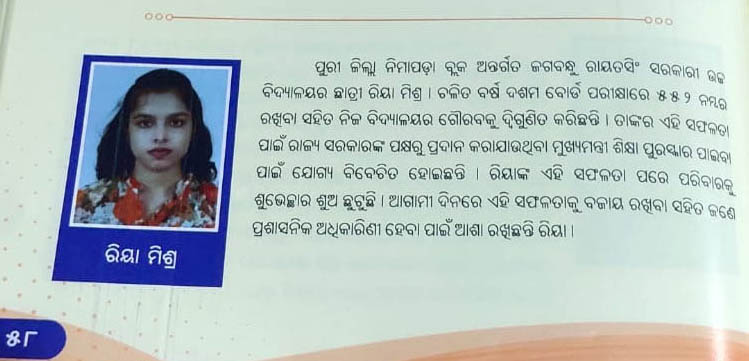 ଭୁବନେଶ୍ୱର:୧୧/୯-ବର୍ଷେ ବିତିଲାଣି । ଦଶମ ବୋର୍ଡ ପରୀକ୍ଷାରେ ୫୫୨ ନମ୍ବର ରଖି ୨୦୨୪ରେ ମୁଖ୍ୟମନ୍ତ୍ରୀ ଶିକ୍ଷା ପୁରସ୍କାର ପାଇବାକୁ ଯୋଗ୍ୟ ବିବେଚିତ ନିମାପଡ଼ା ଜଗବନ୍ଧୁ ରାୟତସିଂ ସରକାରୀ ଉଚ୍ଚ ବିଦ୍ୟାଳୟର ଛାତ୍ରୀ ରିୟା ମିଶ୍ରଙ୍କୁ ଏ ପର୍ଯ୍ୟନ୍ତ ପୁରସ୍କାର ବାବଦ ଅର୍ଥରାଶି(ପଚାଶ ହଜାର ଟଙ୍କା)ମିଳିଲା ନାହିଁ । ବିଦ୍ୟାଳୟର ପ୍ରଧାନ ଶିକ୍ଷୟିତ୍ରୀ, ବ୍ଲକ ଶିକ୍ଷା ଅଧିକାରୀ ଏବଂ ପୁରୀ ଜିଲା ଶିକ୍ଷା ଅଧିକାରୀଙ୍କ ସମେତ ରାଜ୍ୟ ସରକାରଙ୍କ ପଞ୍ଚସଖା ଶିକ୍ଷାସେତୁ ସଂଗଠନ ପକ୍ଷରୁ ତାଙ୍କୁ ପୁରସ୍କାର ବାବଦ ରାଶି ହସ୍ତାନ୍ତର କରିବା ନେଇ ଆବଶ୍ୟକ ପଦକ୍ଷେପ ନିଆ ନ ଯିବା ଫଳରେ ସେ ଏହି ଅର୍ଥ ପାଉନାହାନ୍ତି ।