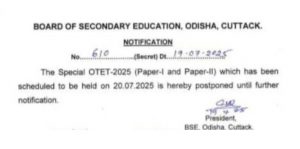 ଭୁବନେଶ୍ୱର, ୨୦/୭-ଆଜି ସକାଳ ୯ଟା ବେଳେ ସ୍ପେସାଲ ଓଟିଇଟି ପେପର-୧ ଏବଂ ଅପରାହ୍ଣ ୨ଟାରେ ପେପର-୨ ପରୀକ୍ଷା ଥିଲା। ଚାକିରିରେ ଥିବା ୭୫ ହଜାର ଶିକ୍ଷକ ଶିକ୍ଷୟିତ୍ରୀ ପରୀକ୍ଷା ଦେଇଥାନ୍ତେ।ପରୀକ୍ଷା ପାଇଁ ସକାଳୁ ବାହାରିଥିବା ପରୀକ୍ଷାର୍ଥୀ ପରୀକ୍ଷା ବାତିଲ ଖବର ପାଇଥିଲେ। ମାଧ୍ୟମିକ ଶିକ୍ଷା ବୋର୍ଡ଼ ପକ୍ଷରୁ ଏ ସଂକ୍ରାନ୍ତ ନୋଟିସ ପ୍ରକାଶ ପାଇଥିଲା। ପ୍ରଶ୍ନପତ୍ର ଲିକ ହୋଇଥିବା ଜଣ ପଡିଥିଲା ।