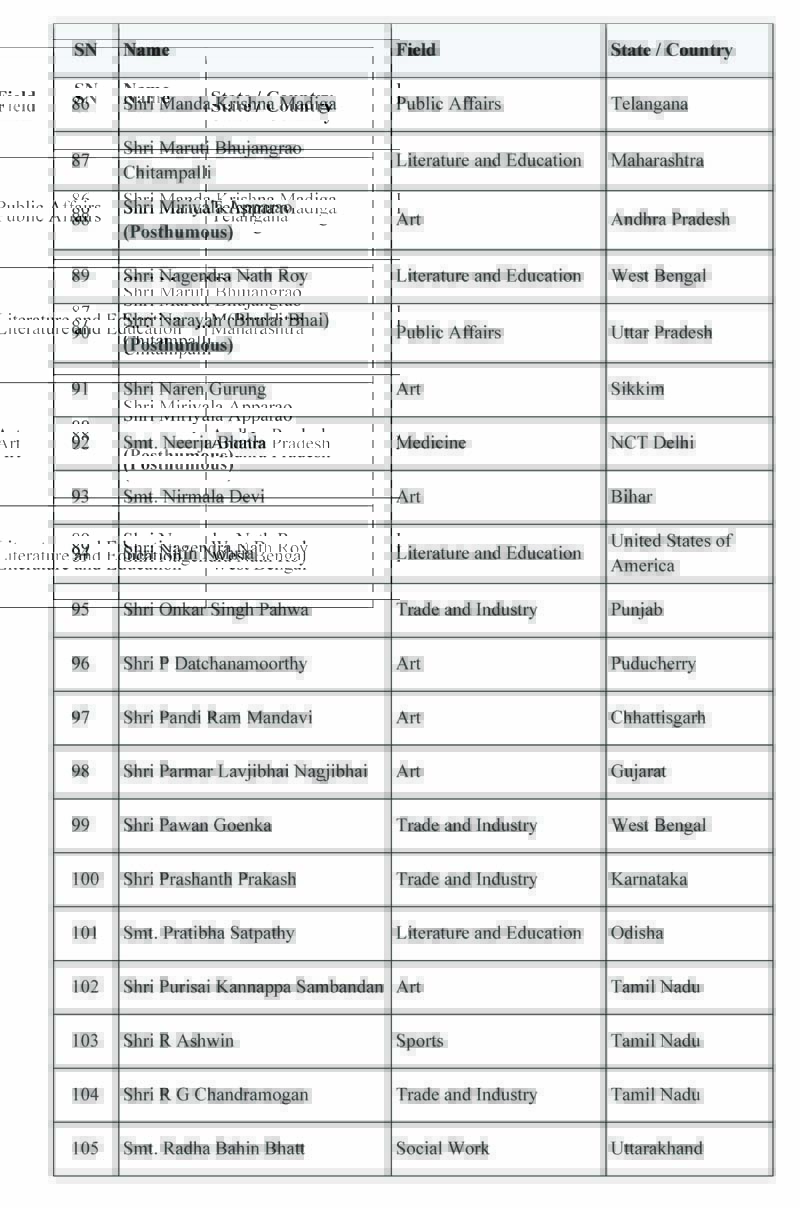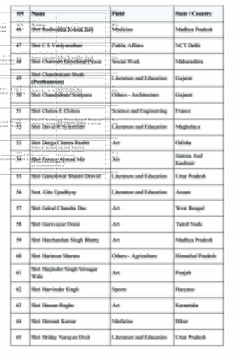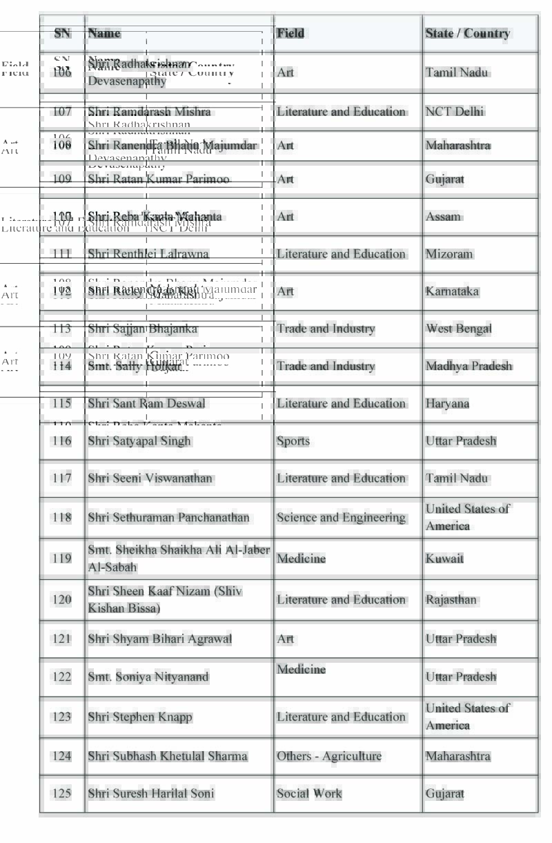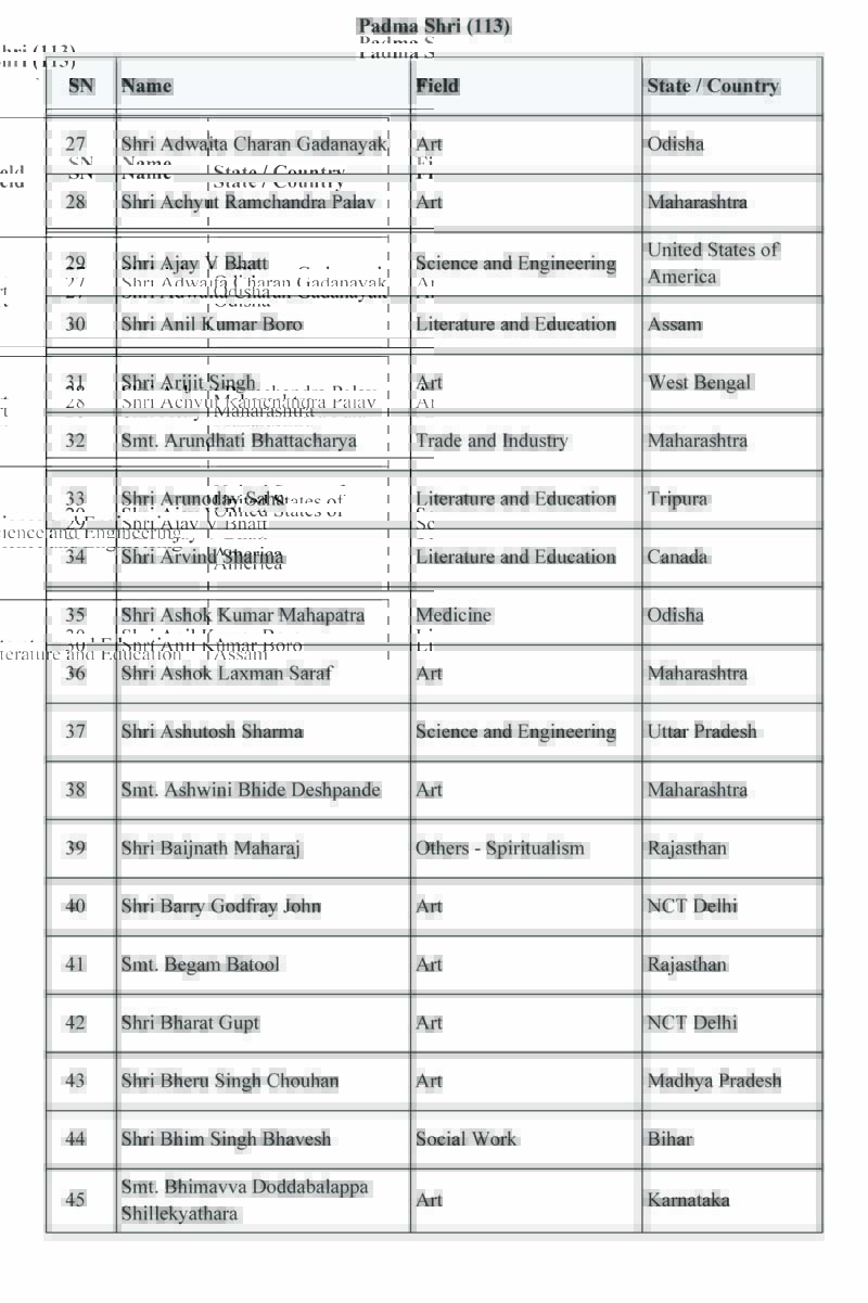 ଓଡ଼ିଶାର ଅଦ୍ୱୈତ ଗଡ଼ନାୟକ-କଳା, ଅଶୋକ କୁମାର ମହାପାତ୍ର-ମେଡିସିନ, ଦୁର୍ଗାଚରଣ ରଣଭୀର-ଓଡ଼ିଶୀ ଓ ପ୍ରତିଭା ଶତପଥୀ-ସାହିତ୍ୟ ଓ ଶିକ୍ଷା ପାଇଁ ମନୋନୀତ ହୋଇଛନ୍ତି । ତାଲିକାରେ ଥିବା ତଥ୍ୟ ଅନୁଯାୟୀ ୭ ଜଣଙ୍କୁ ପଦ୍ମବିଭୂଷଣ, ୧୯ ଜଣଙ୍କୁ ପଦ୍ମଭୂଷଣ ଏବଂ ୧୧୩ ଜଣଙ୍କୁ ପଦ୍ମଶ୍ରୀ ପାଇଁ ମନୋନୀତ କରାଯାଇଛି।