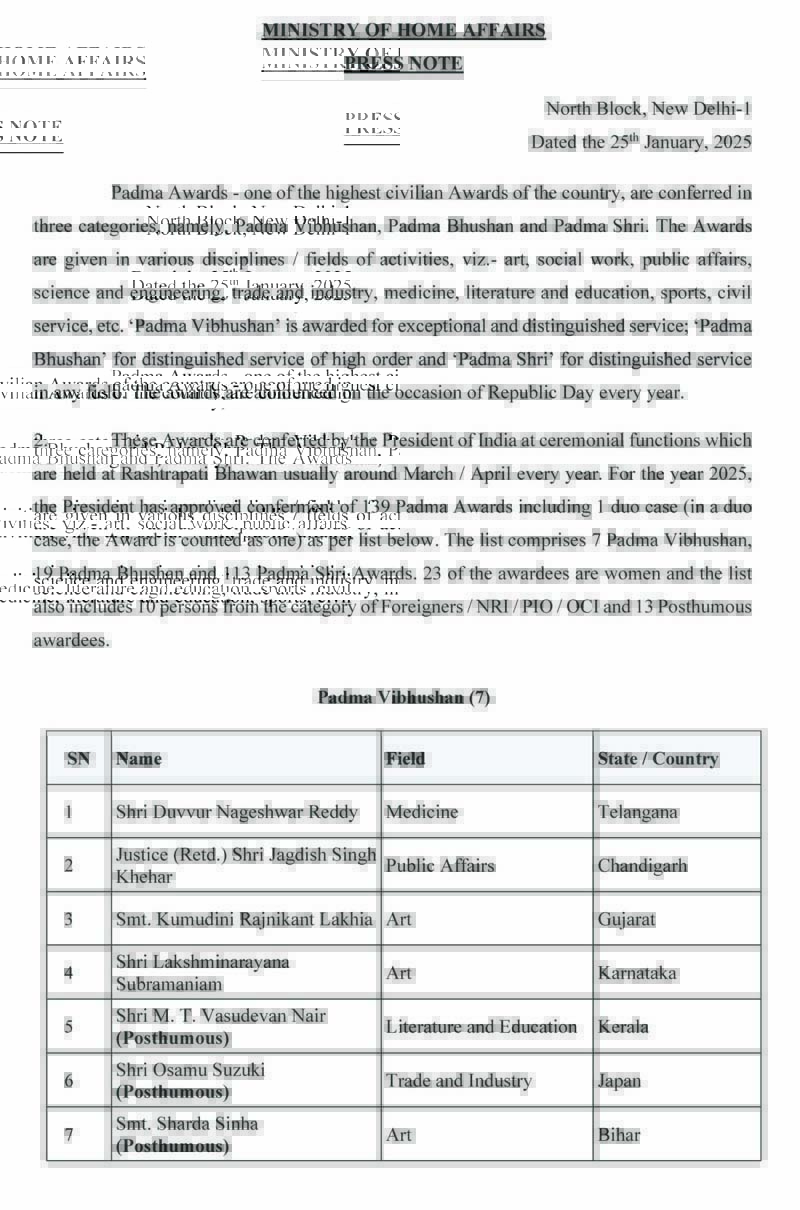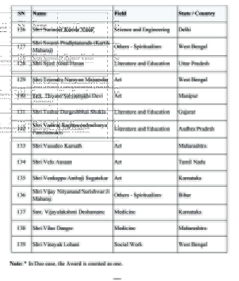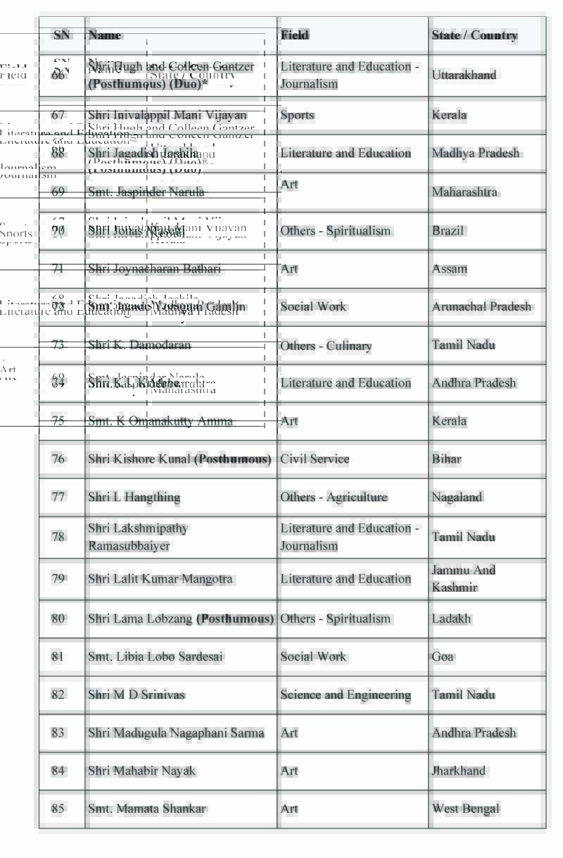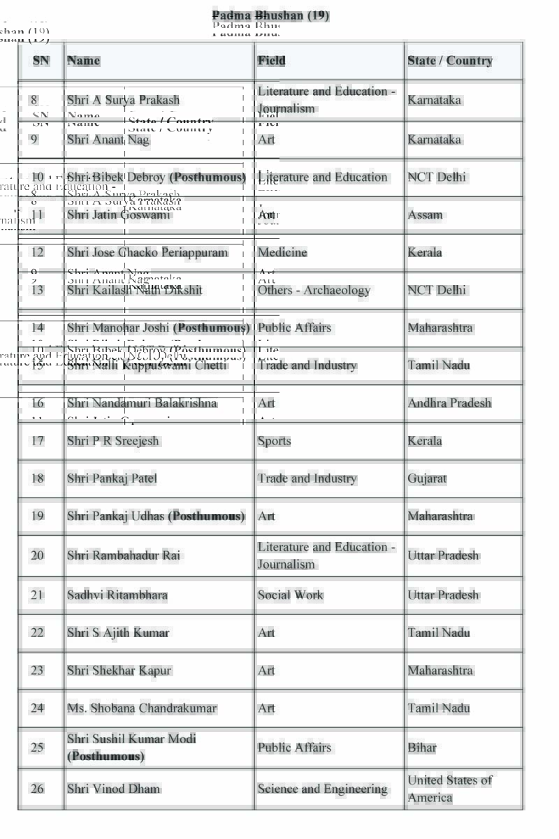 ଓଡ଼ିଶାର ଅଦ୍ୱୈତ ଗଡ଼ନାୟକ-କଳା, ଅଶୋକ କୁମାର ମହାପାତ୍ର-ମେଡିସିନ, ଦୁର୍ଗାଚରଣ ରଣଭୀର-ଓଡ଼ିଶୀ ଓ ପ୍ରତିଭା ଶତପଥୀ-ସାହିତ୍ୟ ଓ ଶିକ୍ଷା ପାଇଁ ମନୋନୀତ ହୋଇଛନ୍ତି । ତାଲିକାରେ ଥିବା ତଥ୍ୟ ଅନୁଯାୟୀ ୭ ଜଣଙ୍କୁ ପଦ୍ମବିଭୂଷଣ, ୧୯ ଜଣଙ୍କୁ ପଦ୍ମଭୂଷଣ ଏବଂ ୧୧୩ ଜଣଙ୍କୁ ପଦ୍ମଶ୍ରୀ ପାଇଁ ମନୋନୀତ କରାଯାଇଛି।