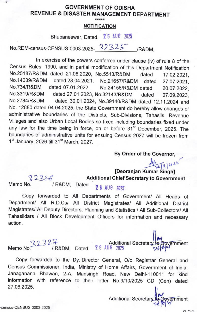 ଭୁବନେଶ୍ୱର:27/8-ରାଜ୍ୟରେ ନୂଆ ପଂଚାୟତ, ବ୍ଲକ ଓ ଜିଲା ଗଠନ କରାଯିବ। ଏଥିପାଇଁ ଜିଲା, ଉପଖଣ୍ଡ, ତହସିଲ, ରାଜସ୍ୱ ଗ୍ରାମ ଓ ପୌରାଞ୍ଚଳର ପ୍ରଶାସନିକ ସୀମାରେ ପରିବର୍ତ୍ତନ କରାଯିବ । ଏହି କାର୍ଯ୍ୟ ଡିସେମ୍ବର 31 ତାରିଖ ସୁଦ୍ଧା ସରିବ। ପ୍ରଶାସନିକ ସୀମା ନିର୍ଦ୍ଧାରଣ କାର୍ଯ୍ୟ ଜନଗଣନା ପୂର୍ବରୁ ସରିବ ବୋଲି ରାଜସ୍ୱ ବିଭାଗ ପକ୍ଷରୁ ଜାରି ବିଜ୍ଞପ୍ତିରେ କୁହାଯାଇଛି ।
