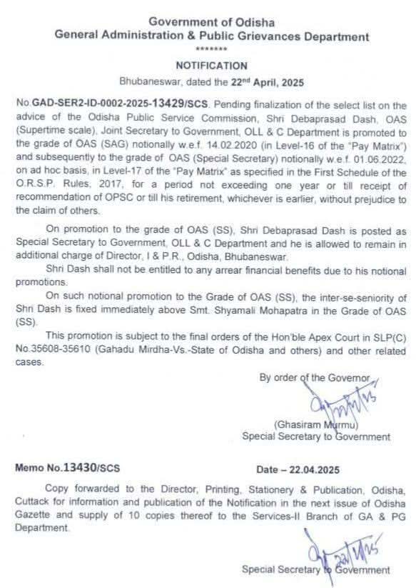 ରାଜ୍ୟ ସରକାର ଓଡିଶା ପ୍ରଶାସନିକ ସେବା ଅଧିକାରୀ ଦେବ ପ୍ରସାଦ ଦାଶଙ୍କୁ ସ୍ୱତନ୍ତ୍ର ସଚିବ ପାହ୍ୟାକୁ ପଦୋନ୍ନତି ଦେଇଛନ୍ତି। ତାଙ୍କୁ ସୂଚନା ଓ ଲୋକସମ୍ପର୍କ ବିଭାଗ ନିର୍ଦେଶକ ଭାବେ ଅତିରିକ୍ତ ଦାୟିତ୍ୱ ପ୍ରଦାନ କରାଯାଇଛି।