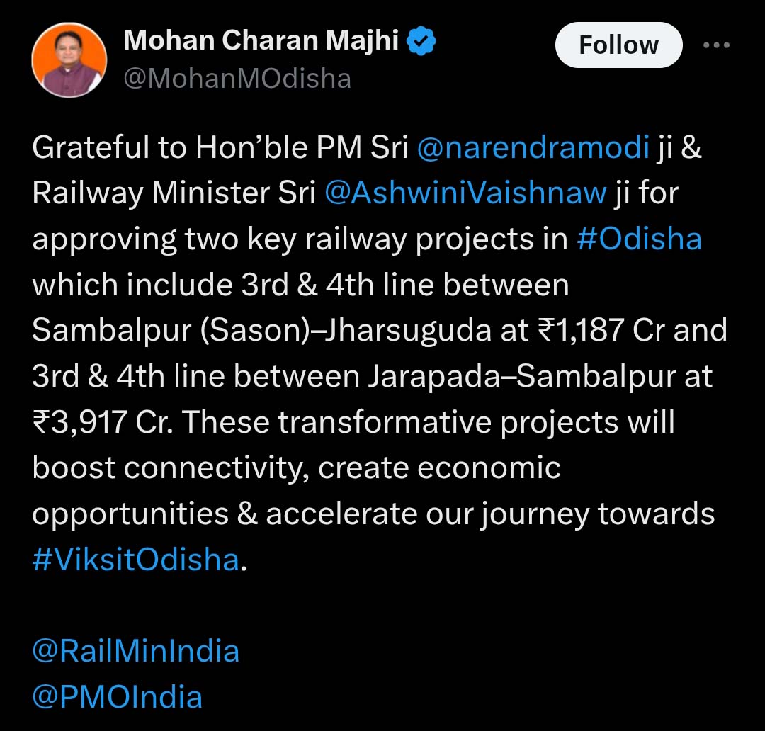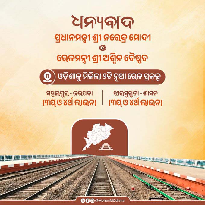ଭୁବନେଶ୍ୱର: ୪/୪-କେନ୍ଦ୍ର ସରକାରଙ୍କ ଅର୍ଥନୈତିକ ବ୍ୟାପାର ସମ୍ପର୍କିତ କ୍ୟାବିନେଟ୍ କମିଟି (CCEA) ଆଜି ସାରା ଦେଶରେ ୪ଟି ରେଳ ପ୍ରକଳ୍ପ ମଞ୍ଜୁର କରିଥିବା ବେଳେ, ସେଥିରୁ ୨ଟି ପ୍ରକଳ୍ପ ଓଡିଶା ପାଇଁ ଉଦ୍ଦିଷ୍ଟ । ଓଡିଶାର ଏହି ଦୁଇଟି ପ୍ରକଳ୍ପ ପାଇଁ ମୁଖ୍ୟମନ୍ତ୍ରୀ ମୋହନ ଚରଣ ମାଝୀ ପ୍ରଧାନମନ୍ତ୍ରୀ ନରେନ୍ଦ୍ର ମୋଦୀଙ୍କୁ ଧନ୍ୟବାଦ ଜଣାଇଛନ୍ତି ।