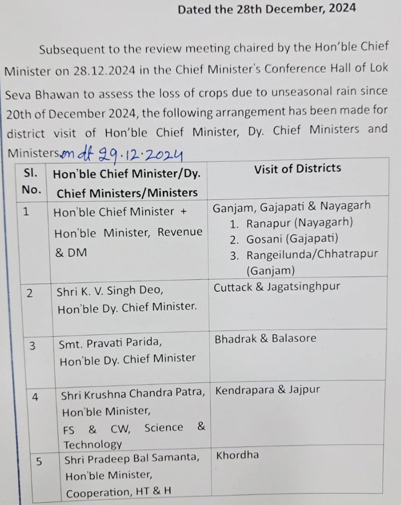 ଅଦିନିଆ ବର୍ଷା ଜନିତ ଫସଲ କ୍ଷୟକ୍ଷତି ସମ୍ପର୍କରେ ମୁଖ୍ୟମନ୍ତ୍ରୀଙ୍କ ସମୀକ୍ଷା