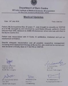 ଭୁବନେଶ୍ୱର:15/7-ମୃତ୍ୟୁ ସହ ସଂଗ୍ରାମ କରି ଶେଷରେ ଆଖି ବୁଜିଛନ୍ତି ବାଲେଶ୍ୱର ଫକୀର ମୋହନ କଲେଜର ପୀଡ଼ିତା ଛାତ୍ରୀ ସୌମ୍ୟାଶ୍ରୀ ବିଶି। ଆତ୍ମାହୁତି ଉଦ୍ୟମ କରିଥିବା ସୌମ୍ୟାଶ୍ରୀଙ୍କ ଶରୀରର 95 ପ୍ରତିଶତ ଜଳି ଯାଇଥିଲା । ତାଙ୍କୁ ଗୁରୁତର ଅବସ୍ଥାରେ ଶନିବାର ଦିନ ଭୁବନେଶ୍ୱର ଏମ୍ସରେ ଭର୍ତ୍ତି କରାଯାଇଥିଲା।ଆଠ ଜଣିଆ ଡାକ୍ତରୀ ଦଳ ତାଙ୍କୁ ବଞ୍ଚାଇବା ପାଇଁ ଉଦ୍ୟମ କରିଥିଲେ। ମାତ୍ର ଶେଷରେ ତାଙ୍କର ମୃତ୍ୟୁ ଘଟିଥିଲା ।