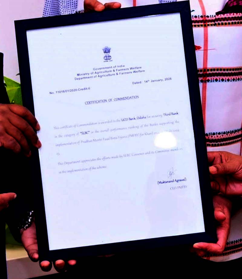 ଭୁବନେଶ୍ୱର-୨୧/୧- ଖରିଫ ୨୦୨୪ ଓ ରବି ୨୦୨୪-୨୫ ବର୍ଷରେ ପ୍ରଧାନମନ୍ତ୍ରୀ ଫସଲ ବୀମା ଯୋଜନାର ସଫଳ କାର୍ଯ୍ୟାନ୍ୱୟନ ଏବଂ ଉଲ୍ଲେଖନୀୟ ପ୍ରଦର୍ଶନ ପାଇଁ ଭାରତ ସରକାରଙ୍କ ଦ୍ୱାରା ଓଡ଼ିଶା ରାଜ୍ୟ ସମବାୟ ବ୍ୟାଙ୍କ ଏବଂ ୟୁକୋ ବ୍ୟାଙ୍କ, ଓଡ଼ିଶା ୟୁନିଟ (ଓଡିଶା ପାଇଁ ଏସଏଲବିସି ସଂଯୋଜକ) ଭାବେ ପୁରସ୍କୃତ ହୋଇଛନ୍ତି।